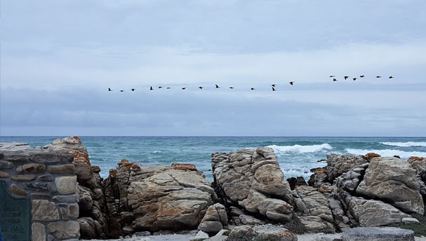 We met our guide for the morning – Willie Meyer at the L’Agulhas lighthouse where our tour began in the museum. An interesting museum with a photographic display of many of the lighthouses of the world! After this we headed down to the actual point where the Indian Ocean meets the Atlantic Ocean! (Even though as Willie told us there are many arguments about this point)! Interesting to see all the cormorants flying in flocks from Left to Right – Willie said they’d been doing this for days!