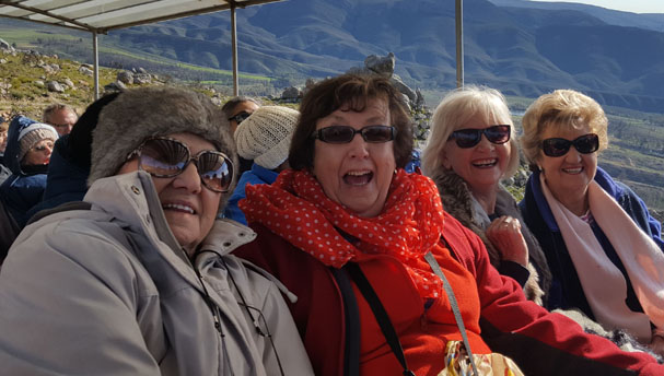 Saturday dawned and six of the ladies were heading to the Protea Farm for their fabulous tractor ride. We arrived at just after 09h30 and waited until 10h00 until the tractor starts up and gets on its journey. The whole Burger family is involved in this business and it was great to see Old Man Burger who previously used to drive the tractor, standing waving us Good-Bye! Little did we know that it was his magic trick – as the tractor passes him, he turns on sprays which give you a ‘wet’ good-bye. This tractor ride is a ‘must-do’ in the Montagu area – my goodness you climb to a distance higher than Table Mountain and at one stage you are literally above the clouds covering Montagu and Robertson below. (1500m above sea level) – these tractor trips started in 1985 and are legendary – producing little surprises along the way! One stop which was great was overlooking the Koo valley when 4 of our group decided with others to walk up the hill! We collected them later – Yvonne was the bravest of all sitting up front on the tractor with some new friends she’d made! Fabulous views from there BUT cold. The coldest part was on top of the mountain where the views are magnificent – it’s here that we all started singing “I’m on the Top of the Hill looking out over creation” – WHAT A VIEW!!
