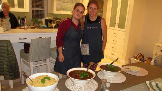 At 18h30 we headed up to Kilzer’s kitchen! Talk about Fun – some of the ladies had come all set with masks / flashing light glasses and the fun began. Jenny and Albie entertain you to a Theatre Kitchen dinner (You Look, We Cook)– they along with their efficient staff produce 2 appetisers and a 3-course dinner all in a relatively small kitchen – we were very fortunate to get a table overlooking the kitchen which made the evening more special. We only left at 10h15 having consumed far too much food – albeit delicious!