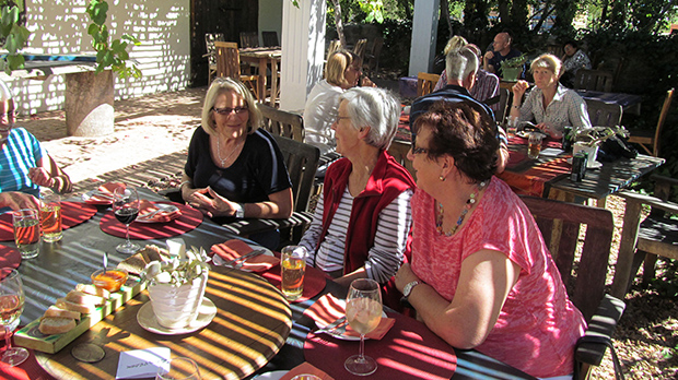 After a hearty breakfast (cold weather increases the appetite!) Brian and Molly headed to the Cango Caves and the rest of us headed into Oudtshoorn for retail therapy. (Don’t you have shops in Cape Town, Girls??!!). On our return to our guest house Molly sat watching a film crew who had chosen Oue Werf for a photo shoot. The Australian Master Chef was visiting the area and cooked a fritata at our guest house. Dinner was, once again, at Oue Werf. Today being our final day, was also an early start! Back to the Meerkats – however, this time totally clear skies and a glorious sunrise had us all very happy. We didn’t have to wait long before the Meerkats appeared. What fun to sit in the bush watching their early morning antics. It’s an experience you won’t easily forget. We were fortunate to see the entire family appear- stretching, yawning and foraging! A fabulous treat. A good breakfast and last minute packing and by 10.00 am we were ready to ‘get-on-the-road’ again. Several stops to gather local produce and we were ready to enjoy lunch at Joubert Tradauw. Their setting is perfect in the vineyards, but, unfortunately, their service doesn’t match the surroundings. Nearly an hour and a half later we could eventually get back on the road home.