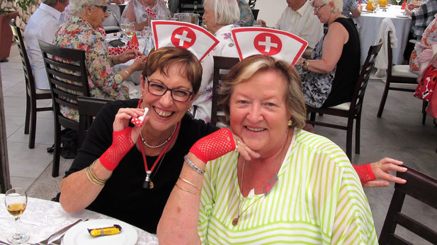 At 12h45 everyone headed into the private dining room which was very cool and comfortable. Carol gave out a few ‘awards’ to several of the ladies – she appointed two ‘nurses’ to look after everyone (as she has done so ALL year and needed a break today); some funny masks were handed out as well as ‘BEWARE Girls on Tour’ badges, an annual trophy which needs to get polished and brought back every year, to the mystery tour!! – all in the name of FUN!