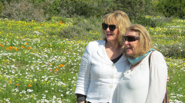 We took the coach up to the viewpoint over Langebaan where fields of blue flowers mixed with the yellow flowers are a sight to see! We could, unfortunately, not go into the parking area of the viewpoint – just too many cars there to turn the coach around.