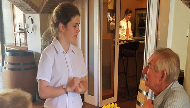 Into the air-conditioned boardroom, we all went, where we sat at desks – “Back at School?!” again! Carima showed us a short background video of the school and answered questions in depth. By now it was 12h45 and Carima went into their restaurant to check whether they were ready for the group. What a treat to be met by these students all with such happy, smiling faces welcoming our group into the restaurant.