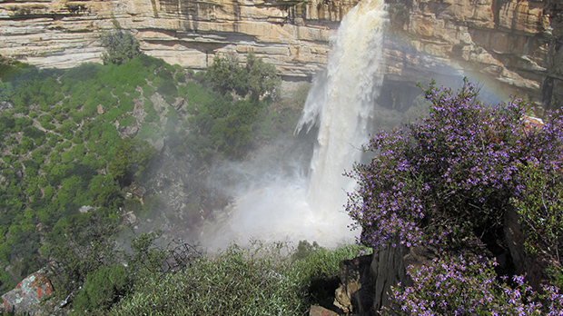 We left Paternoster in the rain and travelled the coastal road through Dwarskersbos, with a stop at Draaihoek Lodge and then through Elandsbaai to Clanwilliam, where we had a lunch break. The local dam had two sluice gates open, which was testament to the amount of rain they had in the area.