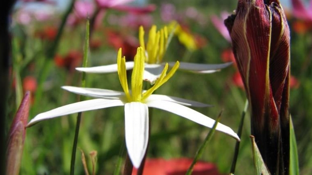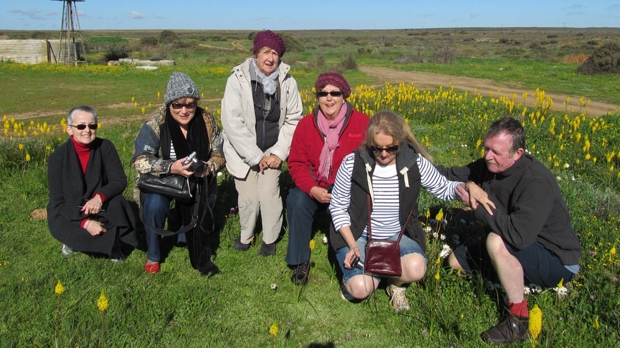 We left on Wednesday in inclement weather with a few drops of rain en route to the West Coast National Park. Arriving by about 10h30 we still had overcast cloudy weather! However, this did not deter the enthusiasm of the people in the coach. We spent a good hour and a half ambling through the flowers; enjoying the healthy animals in the background of the park as well!! Of course, the vantage point where one can overlook Langebaan is always good and this was enjoyed by us all. (The sun shone through here for a brief moment)