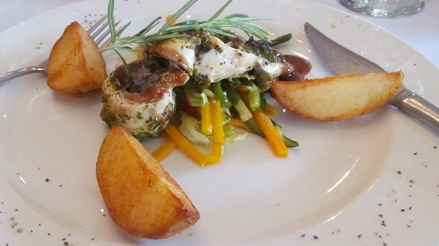 Our lunch was grilled chicken breast filled with feta , mushroom and peppadew served with julienne vegetables, potato wedges and a balsamic glaze followed by a decadent dessert of Chocolate and hazelnut springroll with berry coulis.