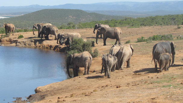 An early start on Monday for our game drive in Addo. We shared this drive with some French people who were so very keen to see ‘Buffalo’ – our game driver very quickly assured us he cannot guarantee the sighting of animals – but just out of camp we saw our first elephants – in the distance – and not worthy of a stop! We came upon a ZEBRA CROSSING – literally in front of our vehicle! At a water hole we saw ONE Buffalo and our game driver picked up several more in the bushes near the waterhole. So, the Frenchmen were happy! Very shortly the rest of our group were happy seeing a whole herd happily playing (and even swimming) in a large waterhole. What a treat!
